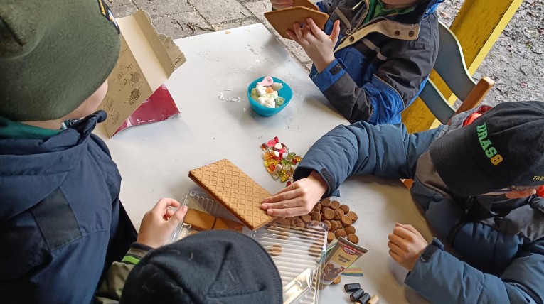 Gelukkig mogen de buiten opkomsten nog steeds doorgaan! De Bevers, Welpen en Scouts hebben buiten onder de overkapping koekhuisjes versierd met snoep. Het was toch moeilijker dan gedacht, maar wel lekker!